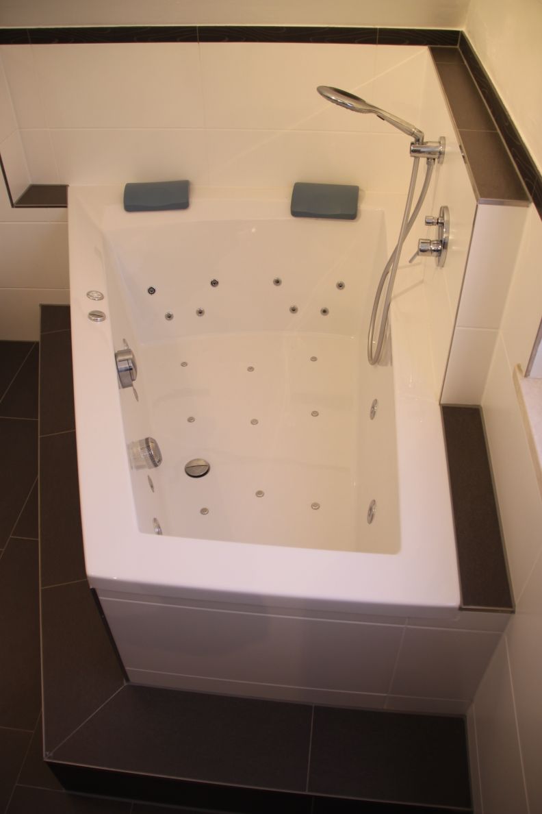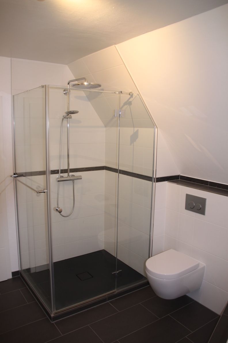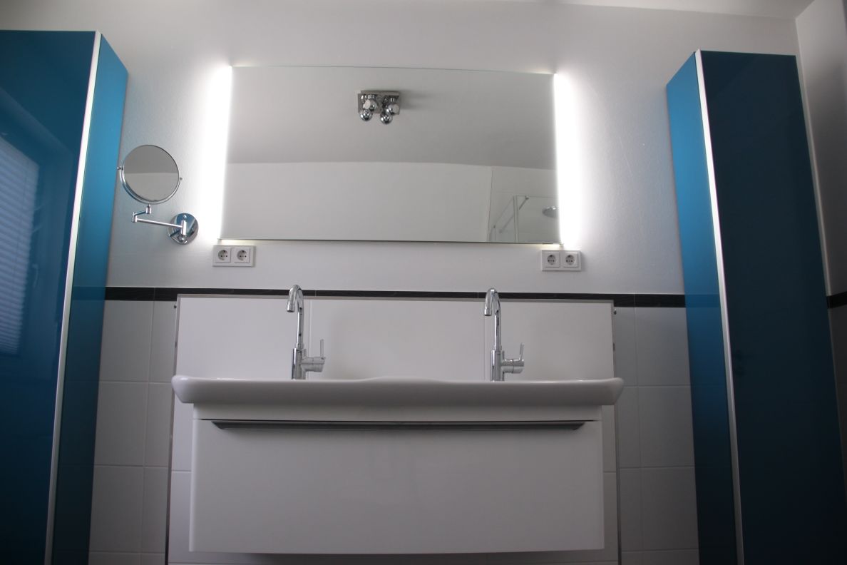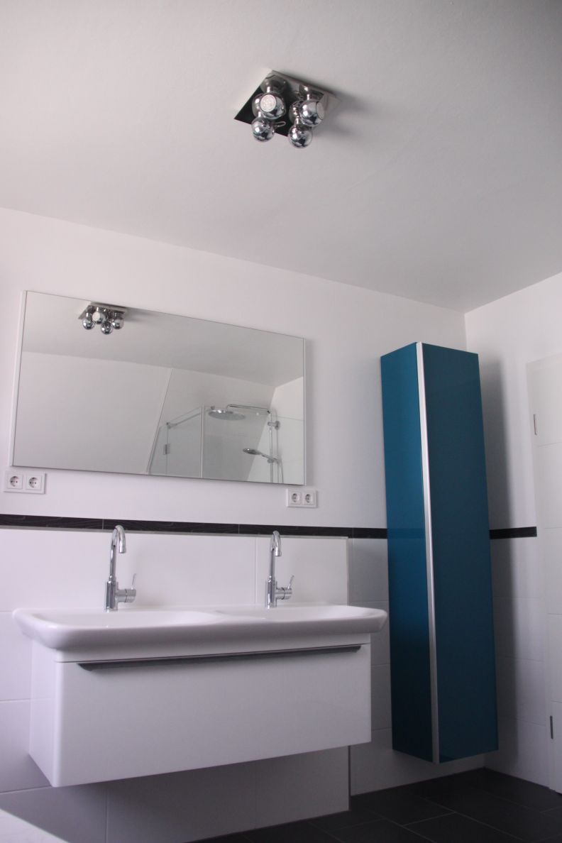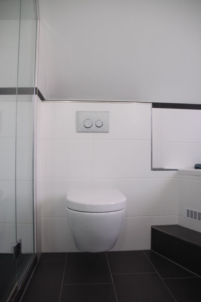 Neben dem neuen Dusch- und Badebereich wurden auch die Waschtischanlage und das WC vollständig erneuert und harmonisch in das Gesamtdesign eingefügt. Der großzügige Doppelwaschtisch mit modernen Armaturen und einem perfekt abgestimmten Unterschrank bietet reichlich Stauraum und unterstreicht den exklusiven Charakter der Sanierung. Durch die präzise Planung und Ausführung konnte der Wunsch der Bauherren nach einem privaten Spa-Bereich realisiert werden, der durch den Einsatz der Whirlwanne und einer Regendusche keine Wünsche an Komfort und Entspannung offen lässt.